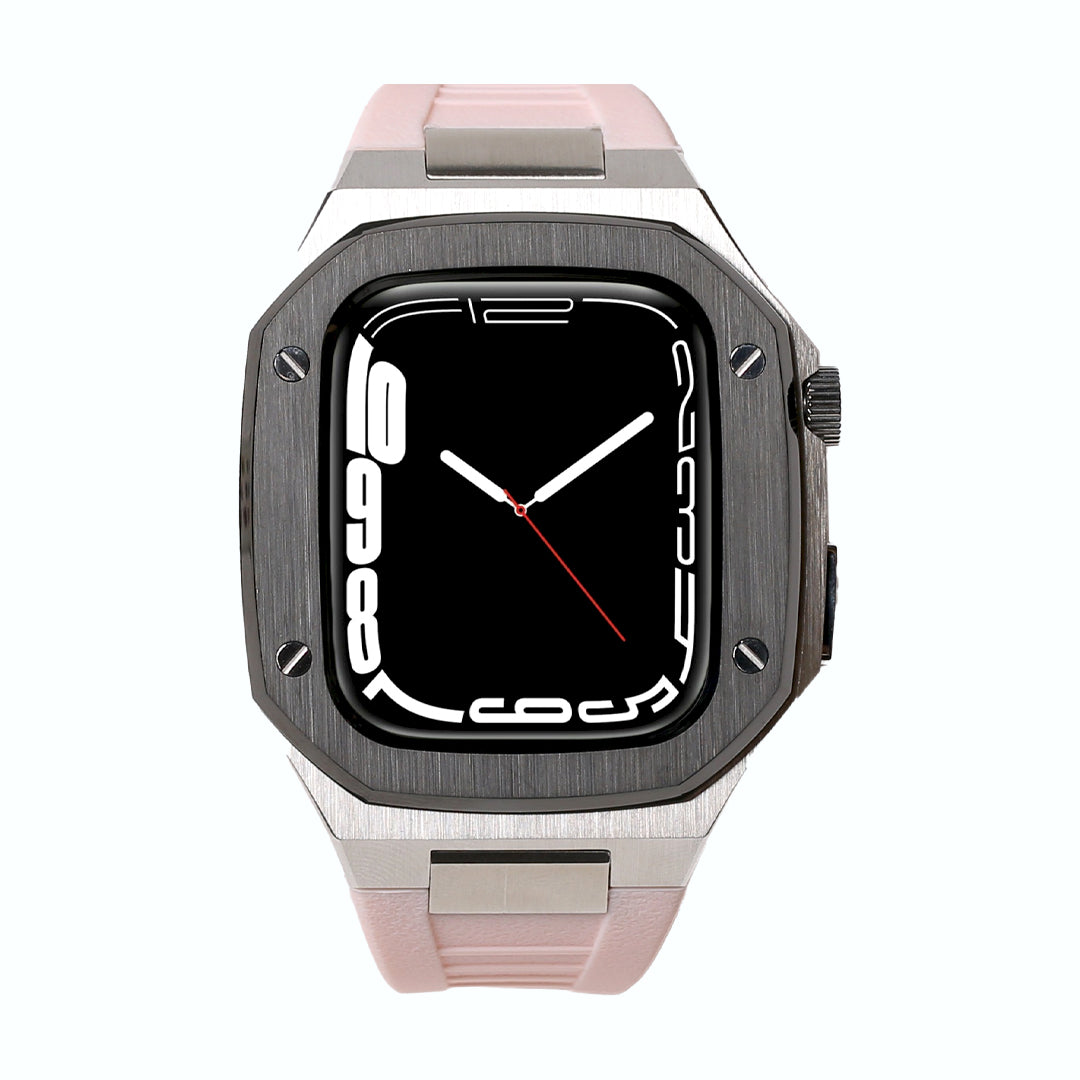 Stainless Steel and Black Bezel Apple Watch Case with Pink Strap