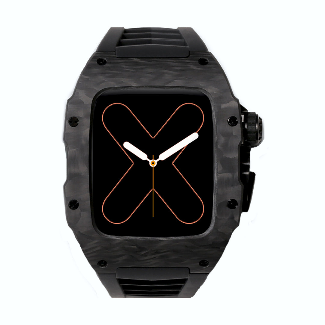 RM Carbon and stainless steel apple watch case with black rubber strap