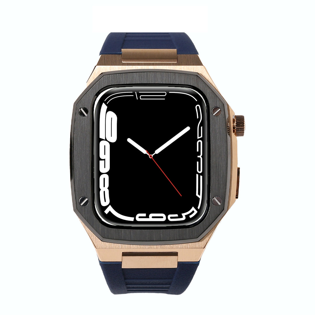 Rose Gold & Black Bezel Apple Watch Case with Navy Blue Silicone Strap