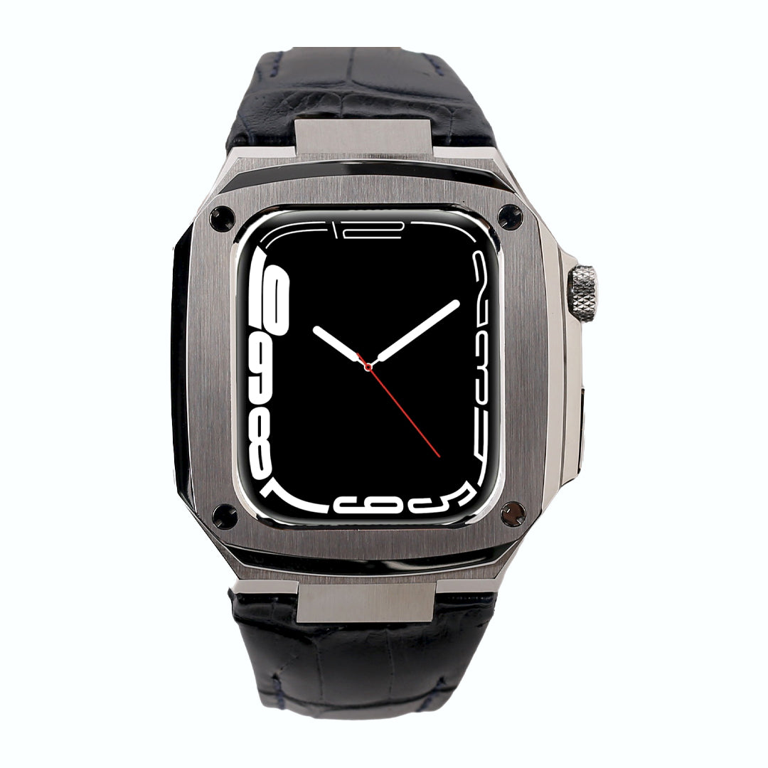 Stainless Steel Apple Watch Case With Navy Blue Leather Strap